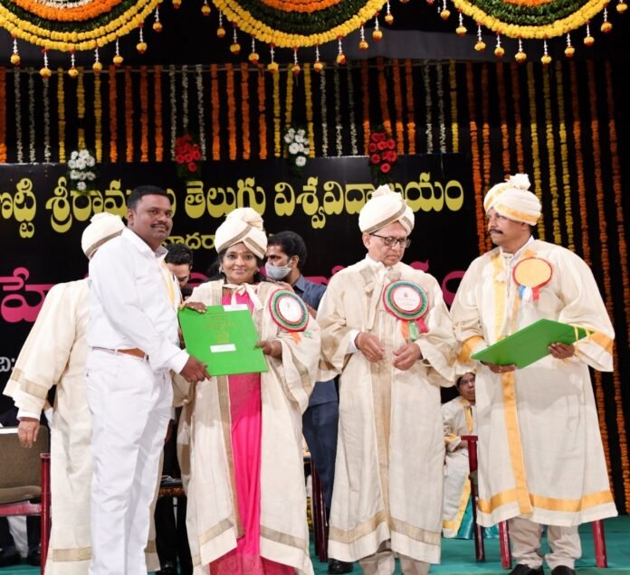 హైదరాబాద్ లోని రవింద్ర భారతిలో పొట్టి శ్రీరాములు తెలుగు విశ్వవిద్యాలయం 15 వ స్నాతకోత్సవ సమావేశంలో బాగంగా ఇటివల భూపాలపల్లి జిల్లా చిట్యాల మండలం చల్లగరిగె గ్రామానికి చెందిన సామాన్య పేదకుటుంబానికి చెందిన హమాలి పని చేసుకుని జీవించే నోముల మొగిలి – రాద దంపతుల కుమారుడు నోమల రాజు జాంబ పురాణం,కథకుల కథలు – తులనాత్మక అద్యయనం అనే అంశంపై ఫ్రొపెసర్ భట్టు రమేష్ పర్యవేక్షణలో అద్యయనం చేసి పొట్టి శ్రీరాములు తెలుగు యూనివర్సిటీ నుండి డాక్టరేట్ మరియు గోల్డ్ మోడల్ పొందారు.అందుకు సంబందించిన పట్టాను నిన్న రవింద్ర బారతీలో రాష్ట్ర గవర్నర్ తమిళసై సౌందరీరాజన్ చేతుల మీదుగా నోముల రాజు అందుకున్నారు.ఈ సందర్బంగా గవర్నర్ అతన్ని అభినందించి శుభాకాంక్షలు తెలిపారు..