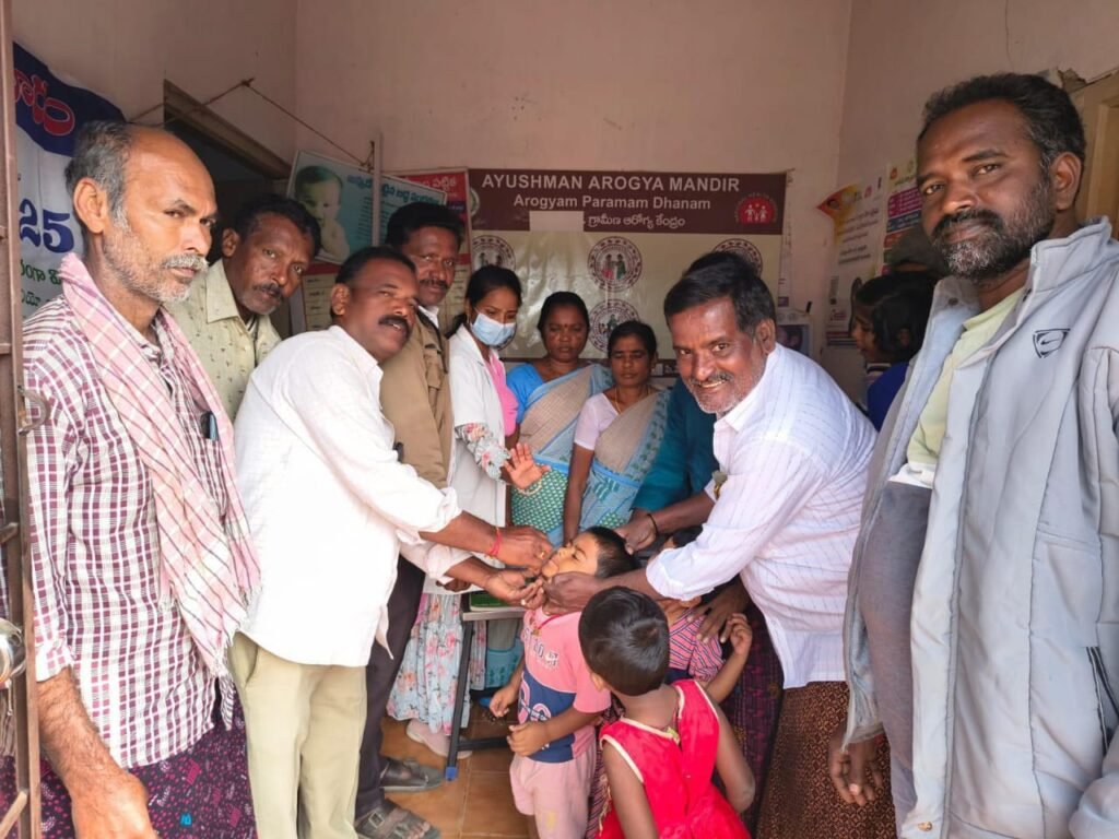 ములకలచెరువు ( ఆంధ్రసమాచార్ )ప్రతినిధి : ములకలచెరువు మండలంలో ఆదివారం పల్స్ పోలియో కార్యక్రమాన్ని డాక్టర్ రేష్మ బేగం, డాక్టర్ లోకేష్ ఆధ్వర్యంలో విజయవంతంగా నిర్వహించారు. ప్రభుత్వ ఆసుపత్రి సిబ్బంది మరియు ఆశా వర్కర్లు అంగన్వాడీ వర్కర్ల సహాయంతో మండలంలో 36 పోలియో బూతులను ఏర్పాటు చేసి 97.2 శాతం సాధించారు. మండలంలో మొత్తం 4758 మంది చిన్న పిల్లలకు పోలియో వ్యాక్సిన్ వేయవలసి ఉండగా 4617 మంది చిన్న పిల్లలకు పోలియో వ్యాక్సిన్ వేయడం జరిగిందని డాక్టర్ రేష్మ తెలిపారు. సోంపల్లి ప్రాథమిక పాఠశాలలో మాజీ సర్పంచ్ ఎర్రగుడి సురేష్, మాజీ మార్కెట్ కమిటీ వైస్ చైర్మన్ కె.వి.రమణ లు ప్రాథమిక ఉన్నత పాఠశాలలో చిన్న పిల్లలకు పోలియో చుక్కలు వేశారు. ఈ కార్యక్రమంలో మాజీ ఎంపీటీసీ వెంకట సిద్దయ్య, గ్రామ కమిటీ అధ్యక్షులు పాల రాము, ఎగవేంటి శంకర రఫీ, షఫీ, అమానుల్లా, బయన్న, గోవిందు,మల్లికార్జున, లతీఫ్ సాబ్, మునుస్వామి, గౌసియా, సున్ని,అంజనప్ప, తదితరులు పాల్గొన్నారు.
